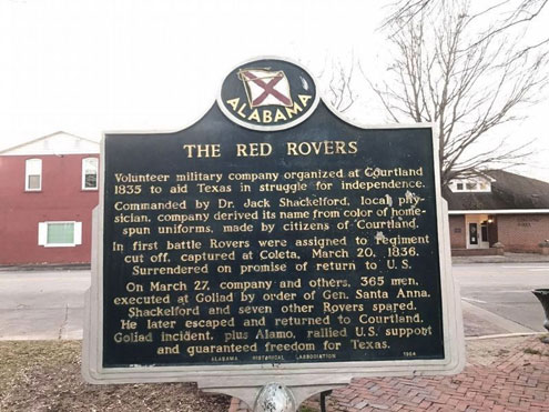 In 1835 in Courtland, Lawrence County, Alabama a company was recruited by Dr. Jack Shackelford to go to Texas and join the fight for independence. The Alabama State Arsenal furnished new muskets. The company called themselves “Red Rovers.” They wore homespun, homemade cotton uniforms, dyed a dark red. They camped for several weeks on the Courtland square and drilled while preparing for the journey to Texas.