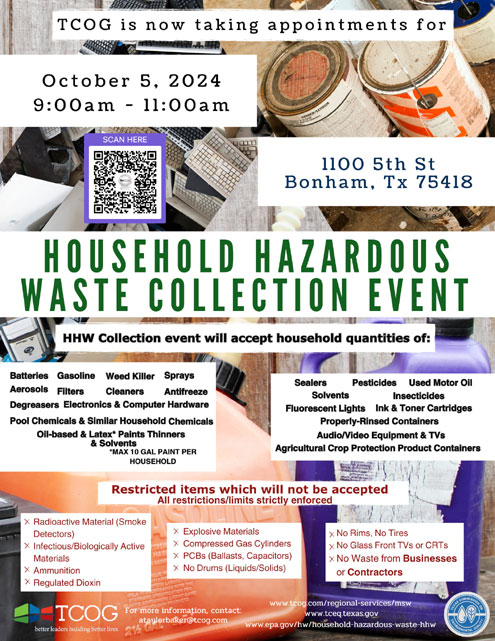 Bonham, Texas -- Texoma Council of Governments is taking appointments for a Household Hazardous Waste Collection event slated for Saturday, October 5, 2024, from 9:00 a.m. until 11:00 a.m., at 1100 5th Street in Bonham, Texas 75418.