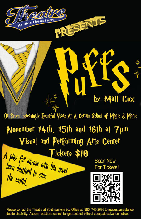Durant, Okla. – Theatre at Southeastern will present three performances of a wildly popular comedy – Puffs! – on November 14, 15, and 16.
