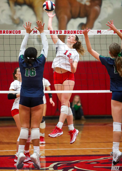 Melissa's Kennedy Stout (12) sends the ball over the net against Frisco Reedy in an Area playoff game on Friday, November 8, 2024 at McKinney Boyd High School. Reedy won the match to advance.