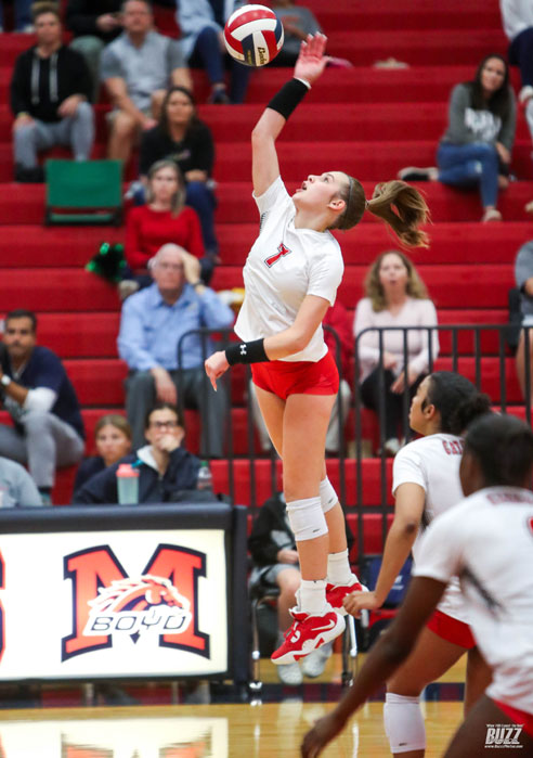 Melissa's Presley Williford (5) sets the ball against Frisco Reedy in an Area playoff game on Friday, November 8, 2024 at McKinney Boyd High School.