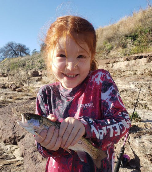 'Tis the season to begin stocking rainbow trout around Texas. These trout are easy to catch, making them a fun way to engage children in the confidence-building sport of fishing – the young lady in the photo won a First Fish Award with her rainbow catch.